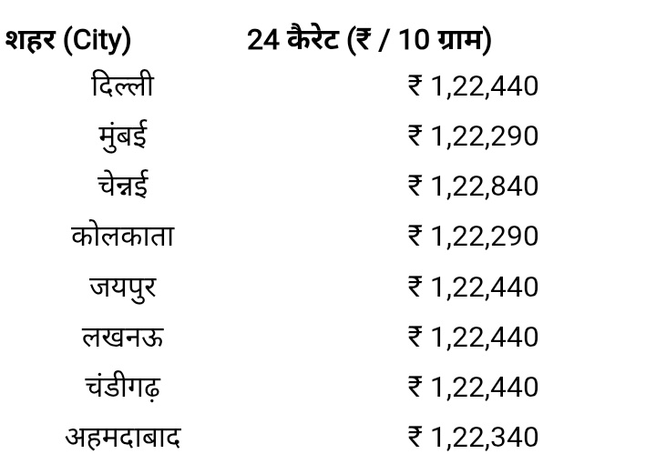 आज करवा चौथ के दिन सोने के भाव में गिरावट दर्ज की गई है वहीं चांदी के भाव में भारी उछाल दर्ज किया गया है।व्रत पर सोने-चांदी की खरीदारी भी जमकर होती है। इससे पहले ही इनकी कीमतों में भारी बदलाव देखने को मिल रहा है, जिसका असर सोने और चांदी के खरीदारों पर भी पड़ेगा। बता दें कि देश की राजधानी दिल्ली, जयपुर, नोएडा, लखनऊ, गाजियाबाद के सर्राफा बाजार में 24 कैरेट सोने की कीमत 1,22,440 रुपये रुपये प्रति 10 ग्राम हो गई, जबकि चांदी की कीमत बढ़कर 1,70,000 रुपये प्रति किलोग्राम हो गई।