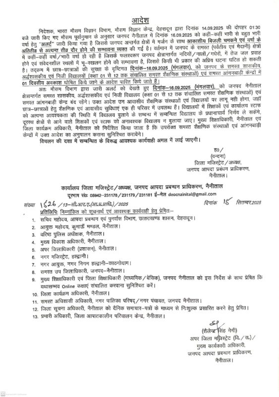 पिथौरागढ़ जिले के धारचूला, मुनस्यारी और डीडीहाट तहसील में कल 16 सितम्बर को डीएम के द्वारा कक्षा 12तक संचालित सभी सरकारी और गैर सरकारी स्कूलों में एक दिवसीय अवकाश घोषित किया गया है। देहरादून, जिलाधिकारी नैनीताल में 16 सितंबर को नैनीताल जनपद के समस्त स्कूल और आंगनवाड़ी केंद्र को बंद रखने के निर्देश जारी किए हैं
