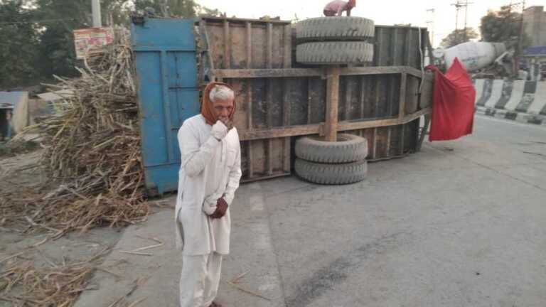 हल्द्वानी:गन्ने से लदी ओवरलोड ट्रैक्टर ट्राली हाइवे पर पलटी… बाल बाल बचे ई रिक्शा और ऑटो देखें -VIDEO